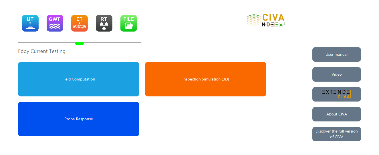 In CIVA Education ET, three types of computation are available: Field Computation, Probe Response, and Inspection Simulation.